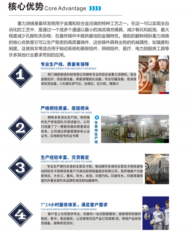 目前公司擁有半自動重力鑄造線一條,配半自動0-90°重力翻轉澆鑄機9臺,日產能可達6500件標準卡鉗。